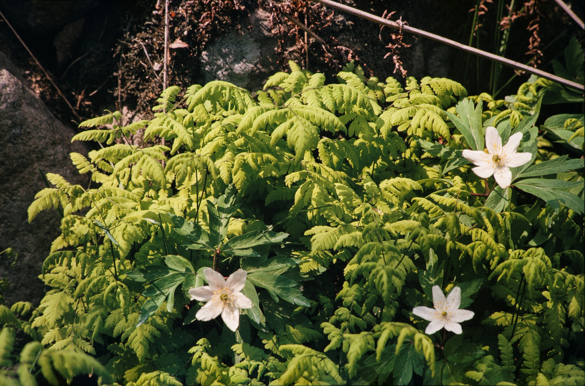 Ormbunkar och vitsippor.