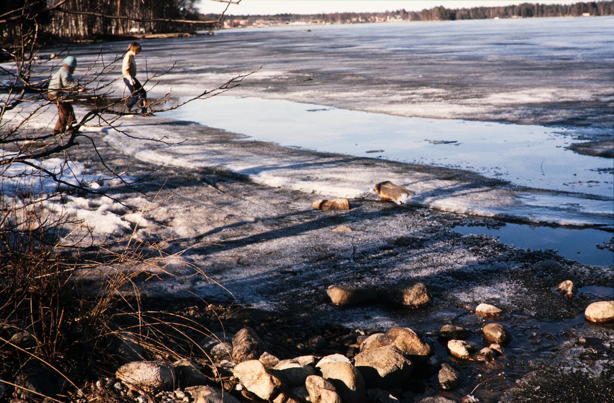 Barn leker vid Helgasjön under islossningen. Växjö, våren 1972.