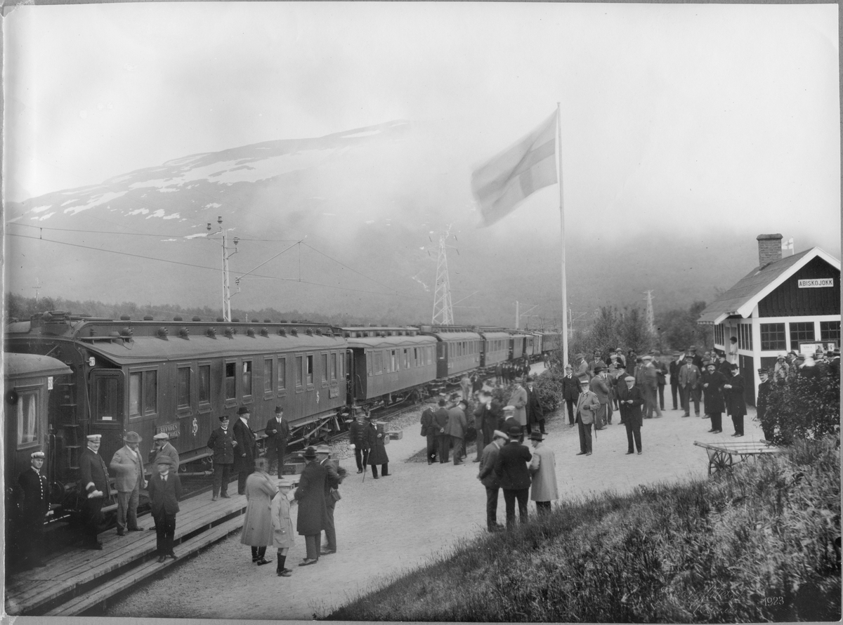 Malmbanans elektrifiering. Besiktningsresa Svartön - Riksgränsen - Narvik. Uppehåll i Abiskojokk.