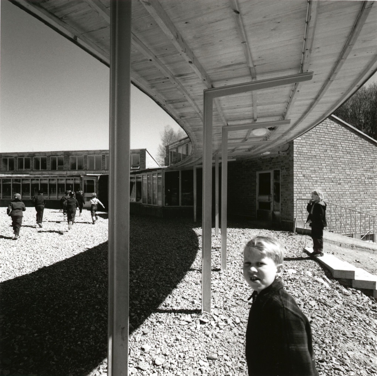Exteriör. Svängt skärmtak i förgrunden. Barn på skolgård.