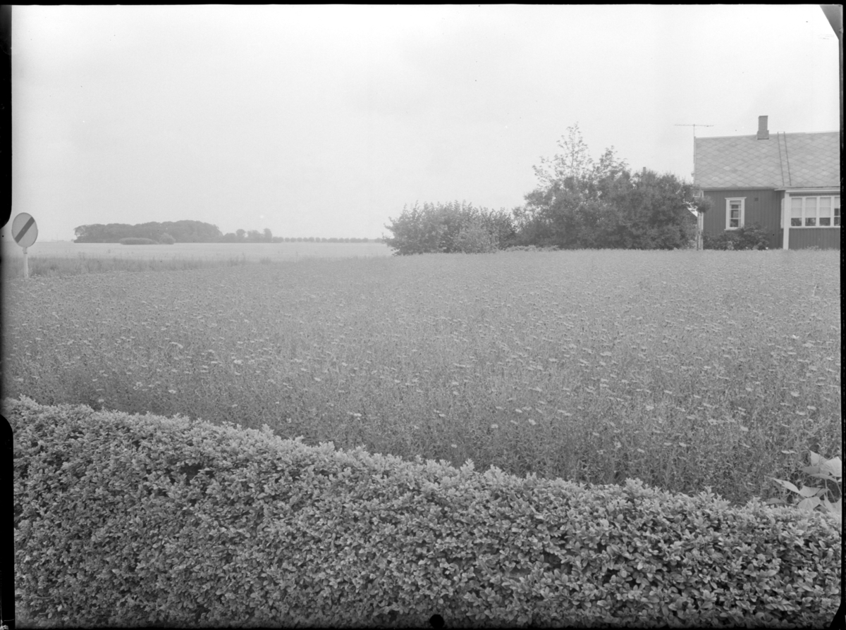 TRÄDGÅRD I SKÅNE MED HÄCK OCH RÖTT LIN