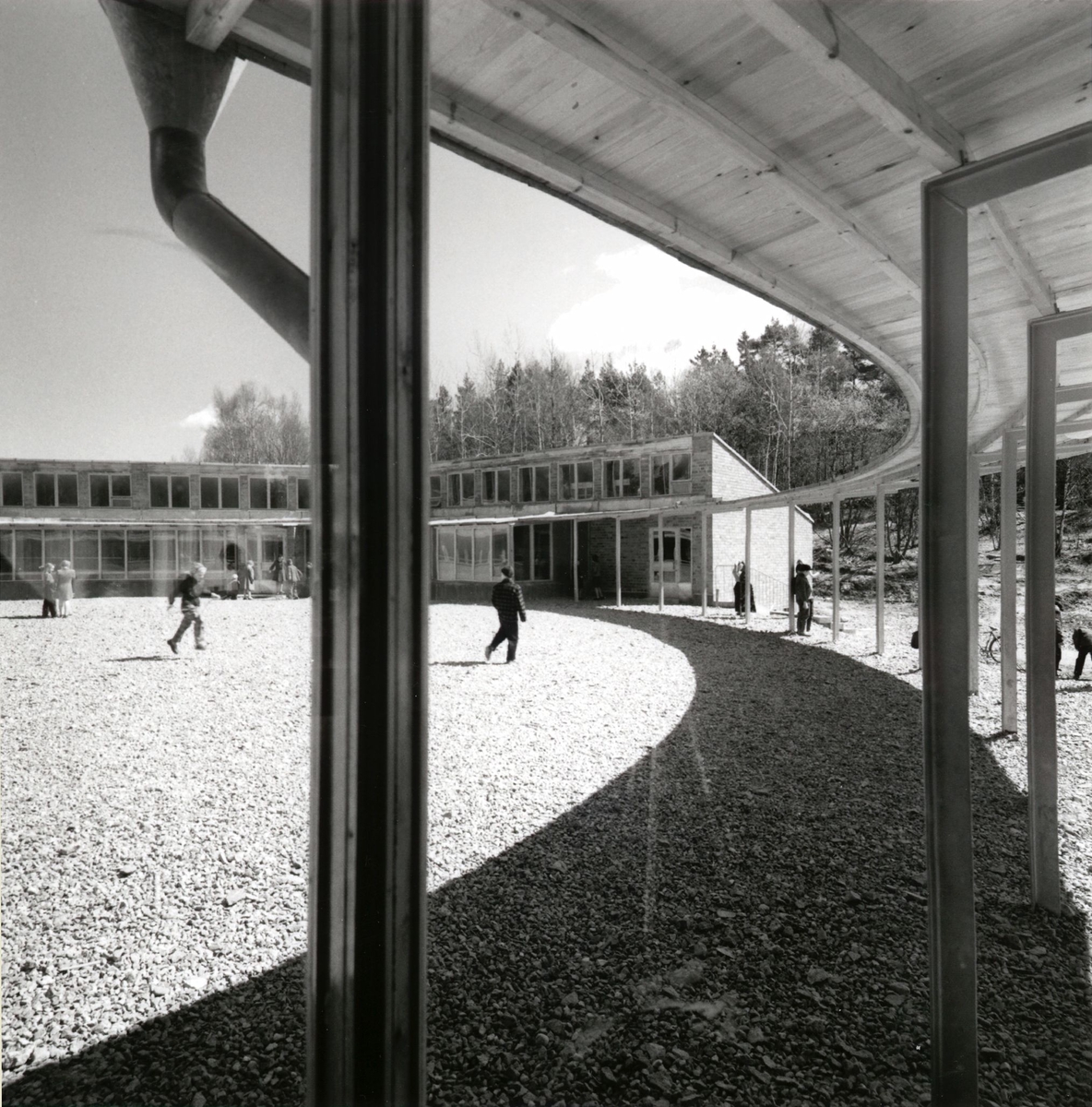 Exteriör. Svängt skärmtak i förgrunden. Barn på skolgård.