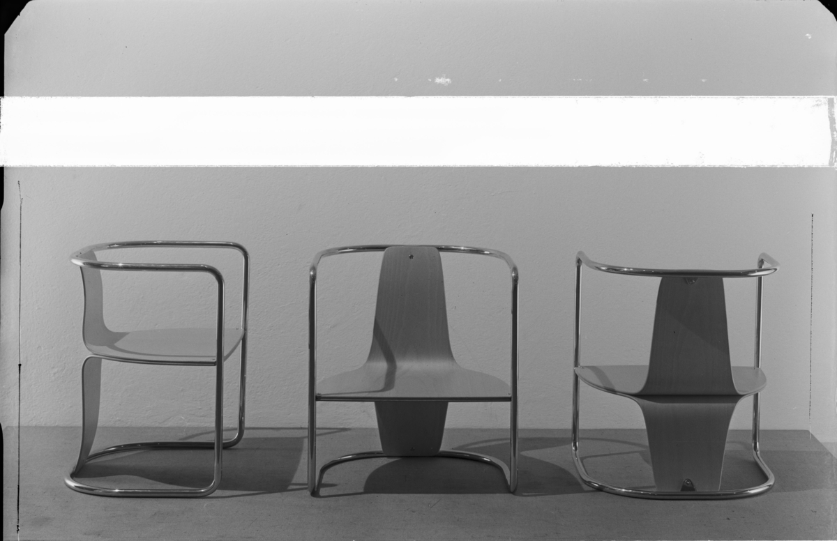 Barnstol (vändbar). Stålrör, blankförkromat. Skiktlimmad bok, plastbehandlad.