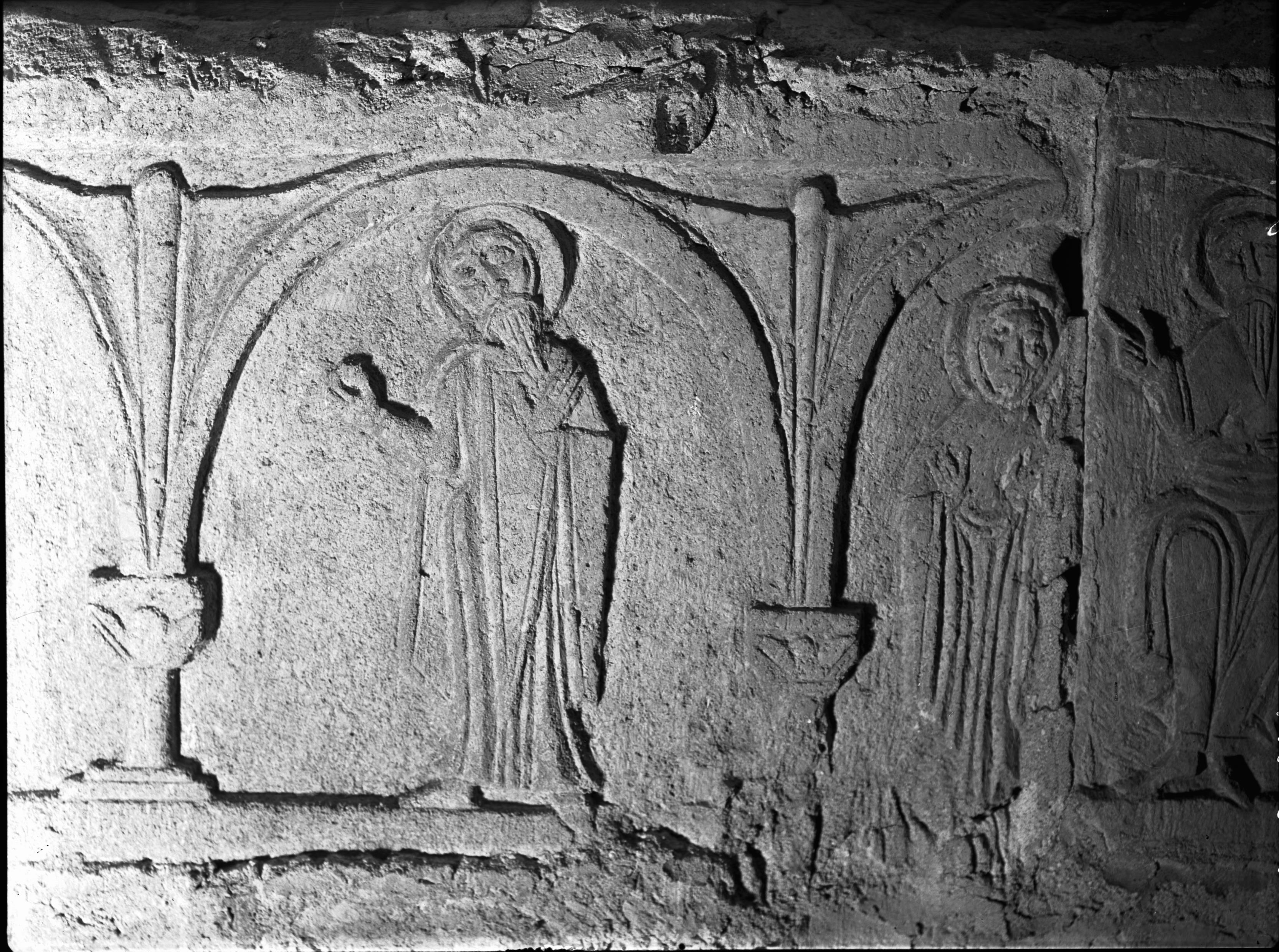 Byzantiosreliefer på korets sydfasad. Stående apostlalik man med utsträckt hand med klot (?).