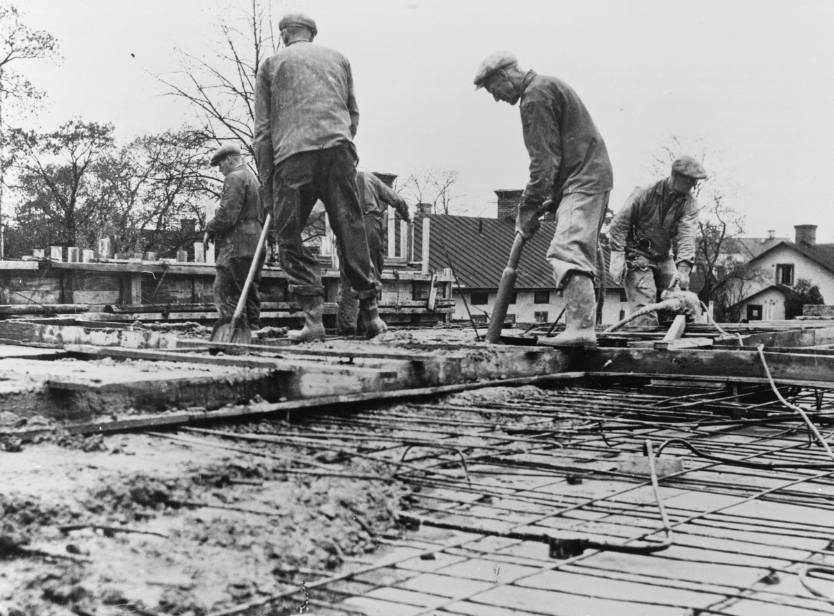 Gjutningsarbeten vid Diös-bygget i kvarteret Blocket i Sandviken, oktober 1953. Vid gjutningsarbetet användes bl.a. "Specialformluckan" tillverkad av plywood från fabriken i Ljusne.