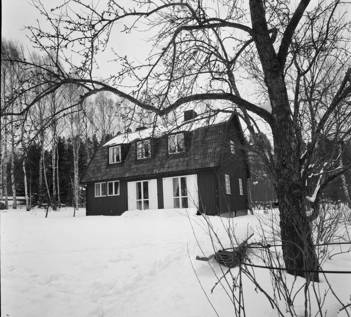 Exteriör, trävilla i snölandskap.