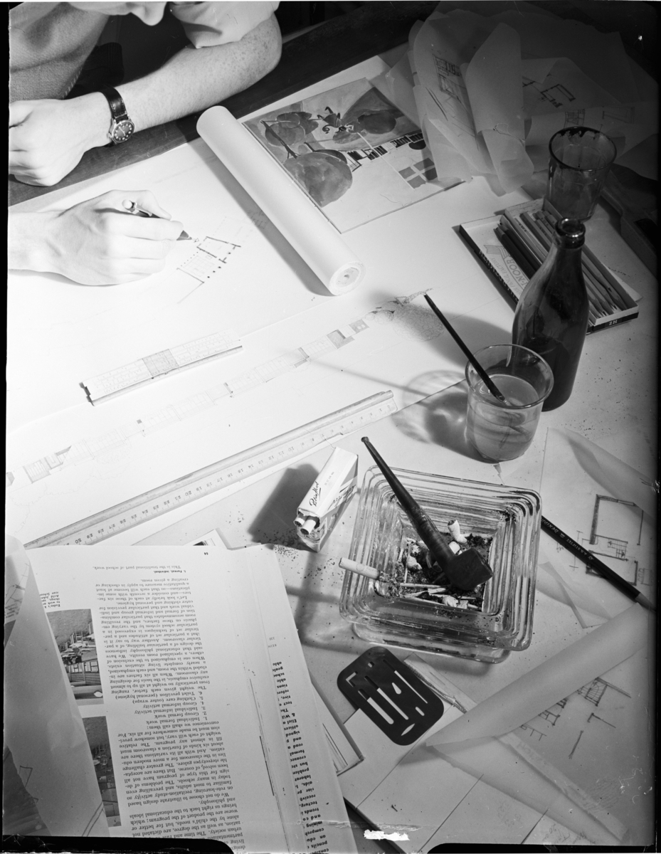 OMSLAGSBILD, ARKITEKRITBORD MED TÄVLINGSRITNINGAR