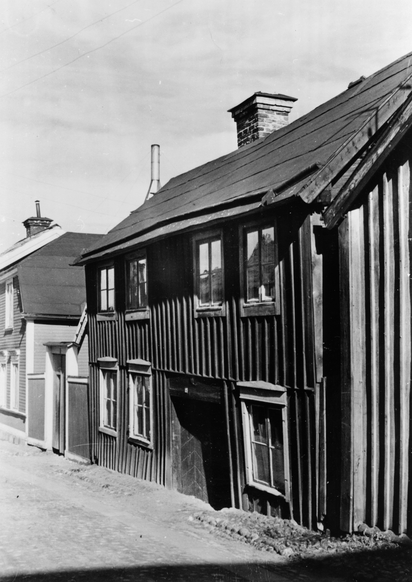 Kvarteret Vreten 7, första kvarteret 128, Boningshuset vid Glasmästargränd 9 med överbygd portgång.