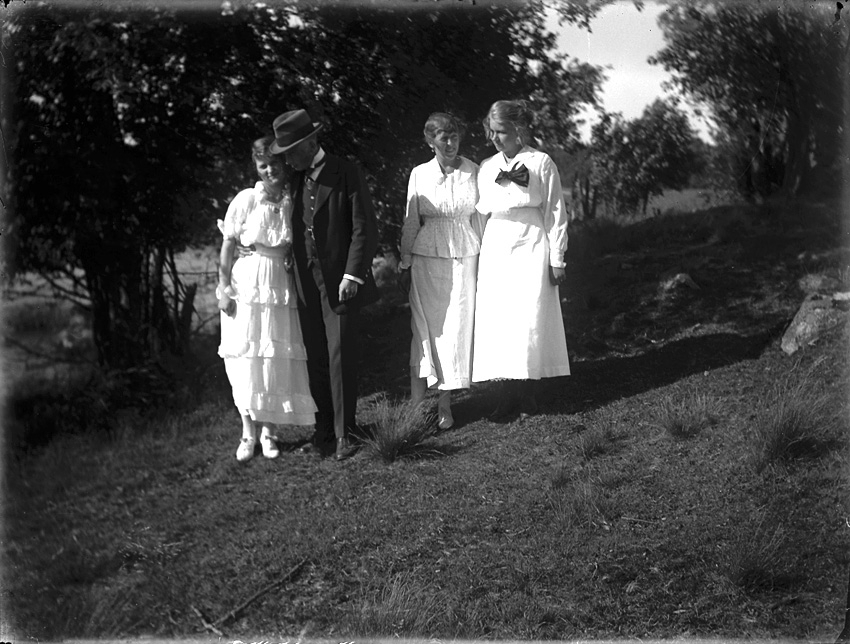 Man och tre kvinnor vid stort stenblock på äng. Ryd, Småland.