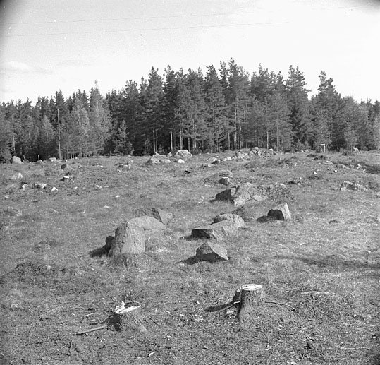 Anläggningstom del av undersökningsområdet, med sprängningssten i förgrunden.
