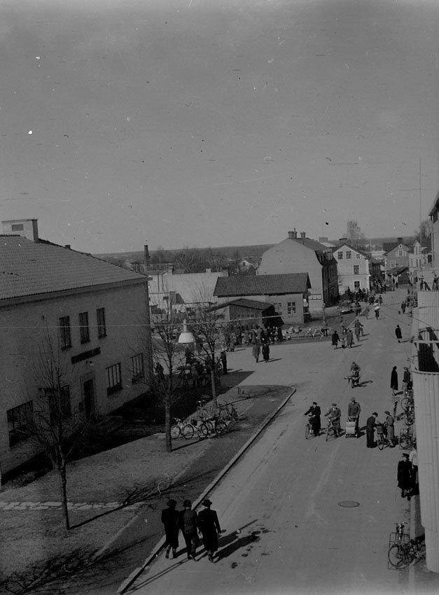 Affärsgata med mycket folk i rörelse.
