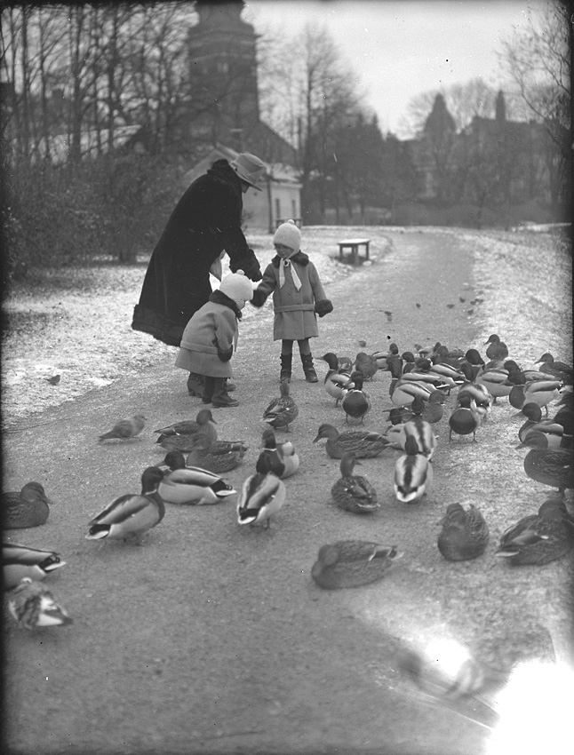 Kvinna och två barn, matar änder och gäss i park nära kyrkan.
