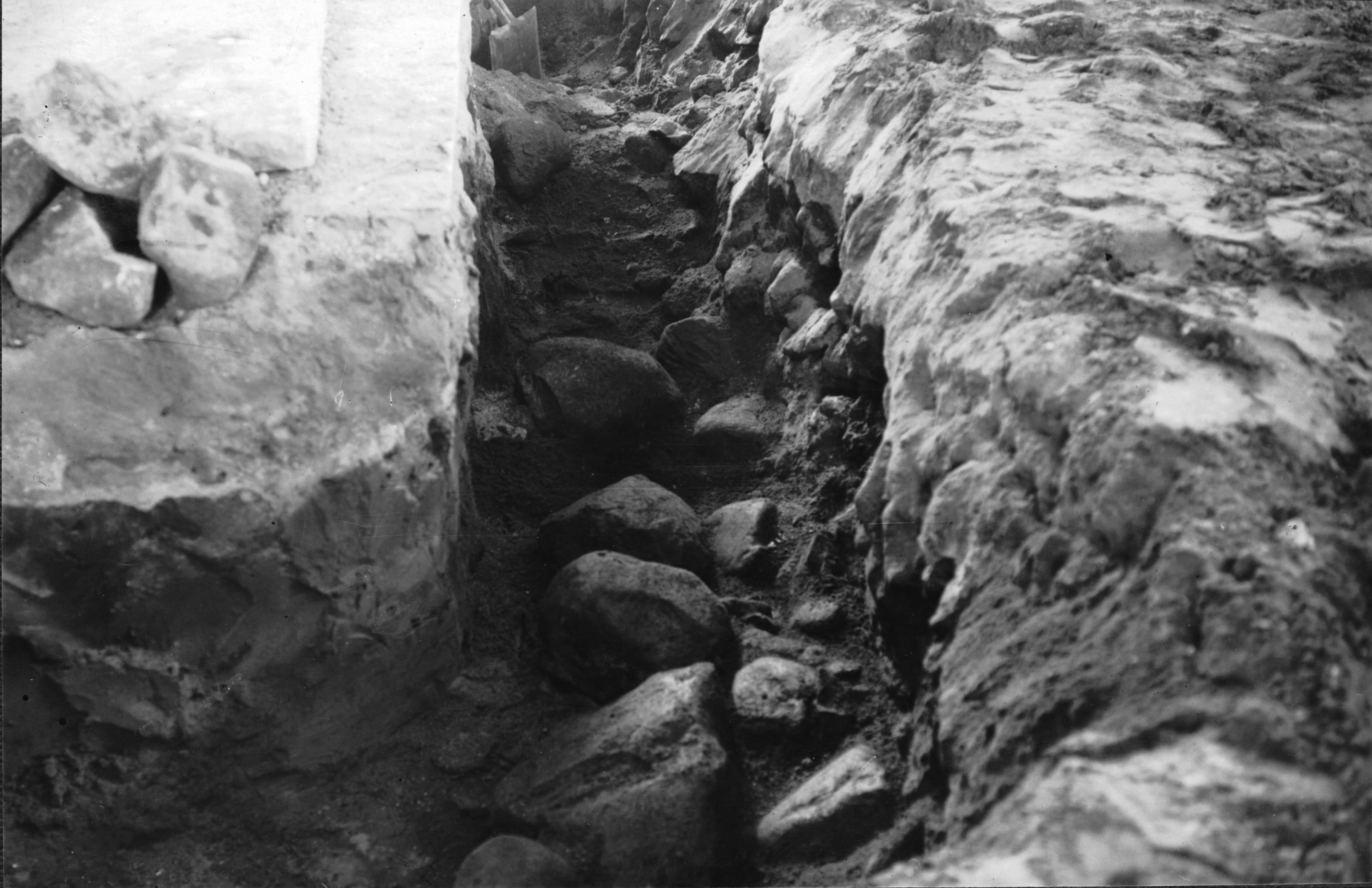Stenarna i gropen tvärs över kyrkan framför koret. Bilden tagen mitt för mittgången mot norr.