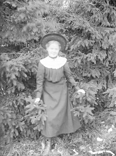 Porträtt, ung dam vid granar.