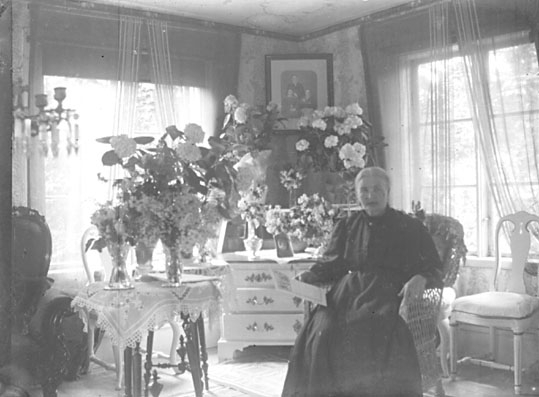 Titel: Porträtt, Sara Wretström, med blommor i vaser.