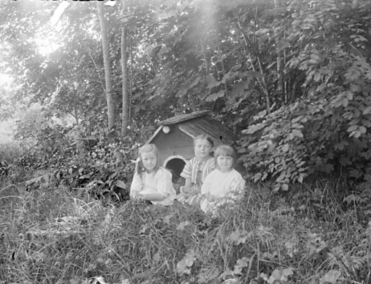 Grupporträtt, tre barn vid hundkoja.