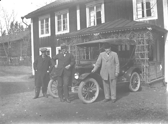 Grupporträtt, tre personer med bil framför gårdens veranda.