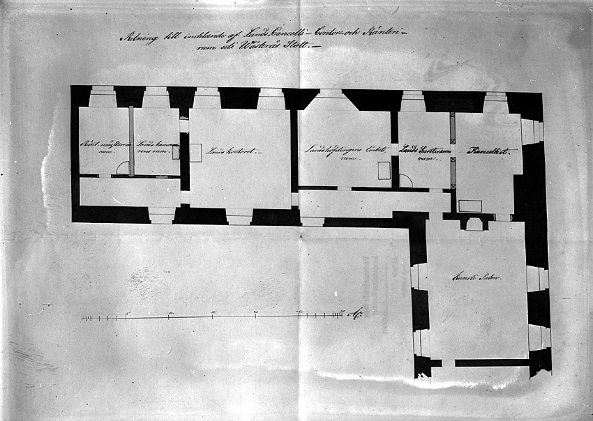 Västerås slott. Planritning av våningen 1 trappa upp, östra längans södra del och kanslisalen i södra längan.