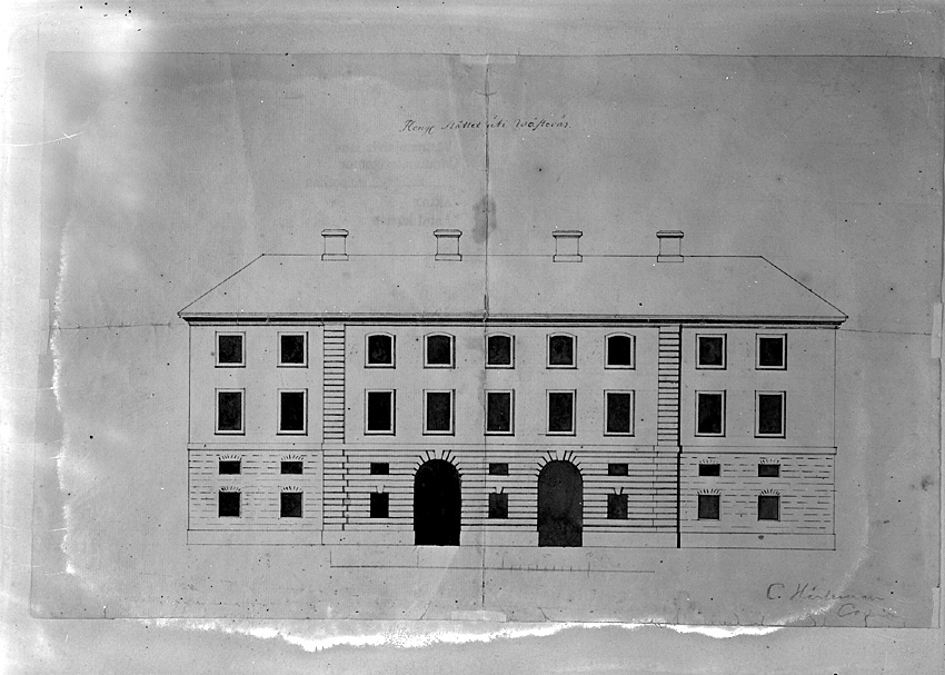 C. Hårlemans ritning till modernisering av Västerås slott 1750. Östra längans ytterfasad.