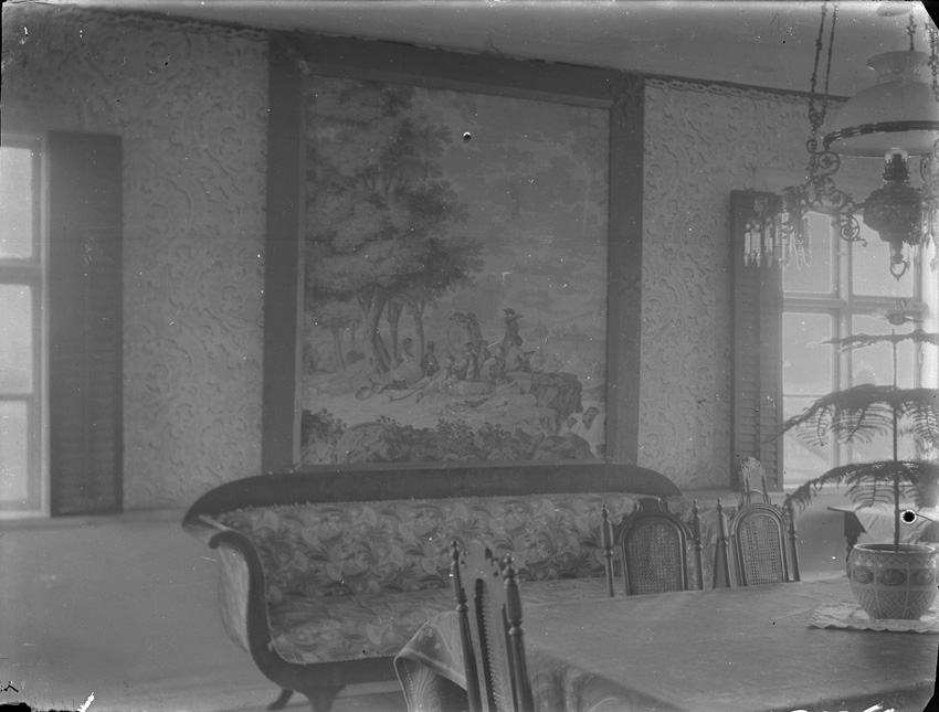 Interiör av sal, målad tapet med soffa nedanför. Västerås.
