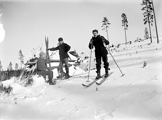 Skidåkare och två personer med hund vid koja, Riddarhyttan.