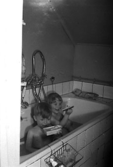 Två barn sitter i badkaret och leker.