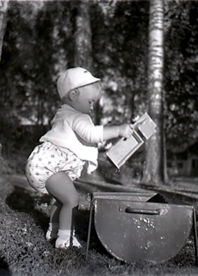 En liten gosse som leker med sina leksaker, bl.a.
