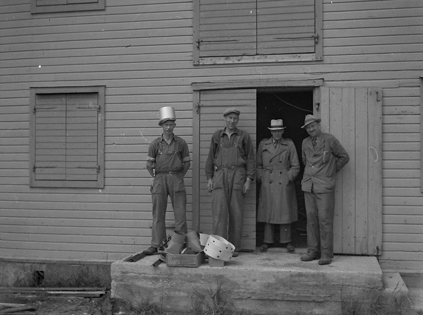 Fyra glada män på trappen till en byggnad.