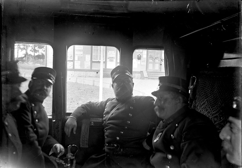 Från "kriget i Norberg", fem militärer i tågkupé. C:a 1890-1900.