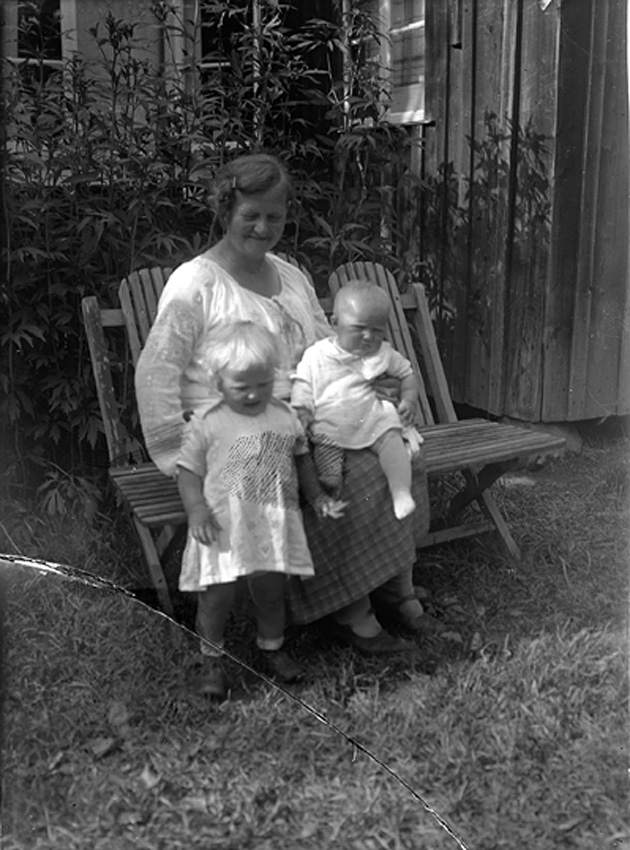 Kvinna med två barn, sitter på trädgårdssoffa framför husvägg. Västerås.