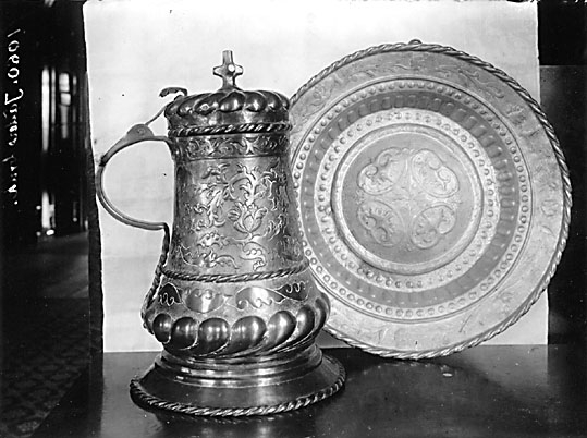Kanna, kredens, och stekfat av koppar på Jädersbruks herrgård.