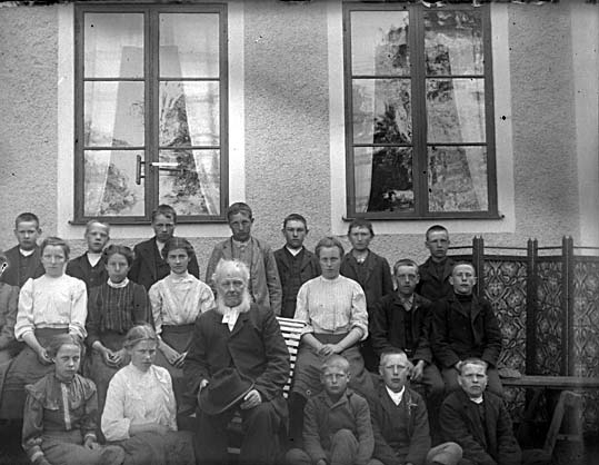 Läsbarn tillsammans med prästen framför prästgården, Lillhärad.