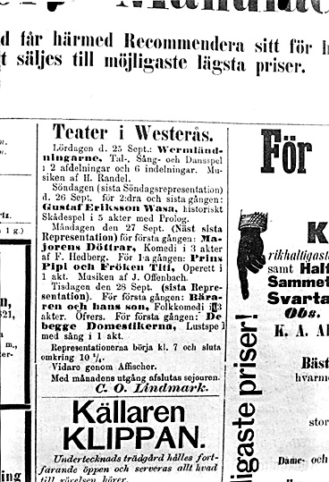 Titel: Teaterannons, Västerås. Införd i Västmanlands läns tidning 1880.