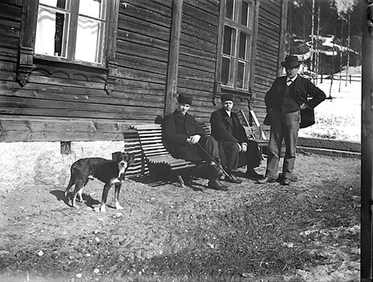 Tre män på/vid en bänk och en hund, Riddarhyttan.