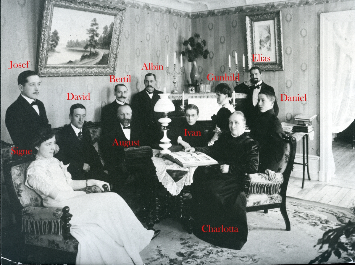 Interiör från Stora Tallbacka. Familjen Hedrén i salongen. C:a 1910.