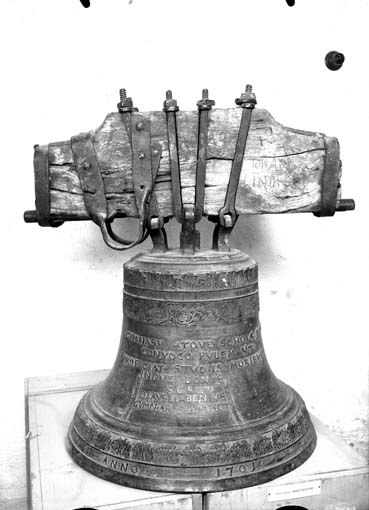 Klocka av malm, daterad 1701, på Västerås läroverk i Västerås.