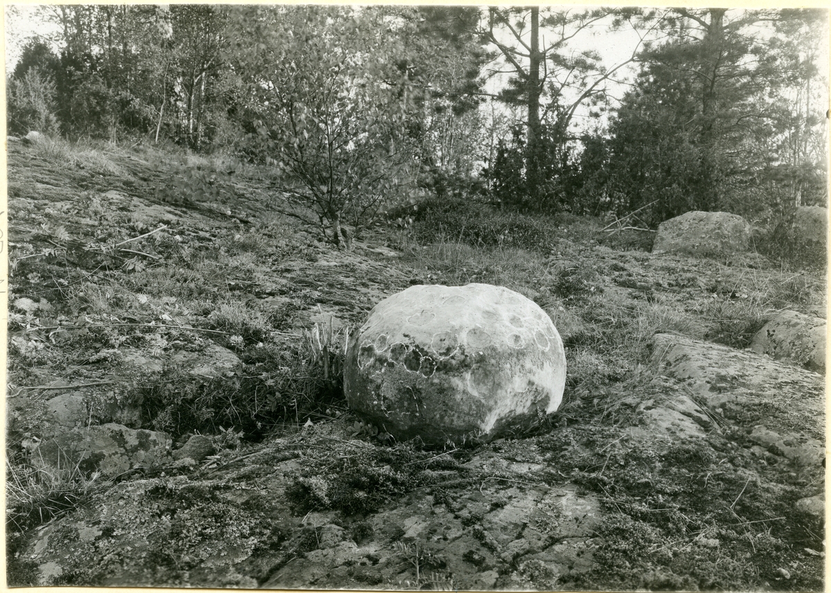 Kultsten med älvkvarnar från järnålderns mitt, vid gravhög i Åskesta, Munktorp sn, Köpings kn.