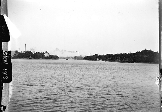 Vy från sjösidan, höga skorstenar. Riddarhyttan.
