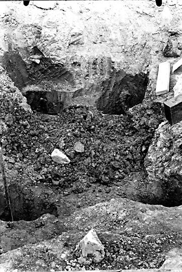Altuna socken Fröslunda RAÄ fornlämning 30. Del av stolpe (4 st) i graven.