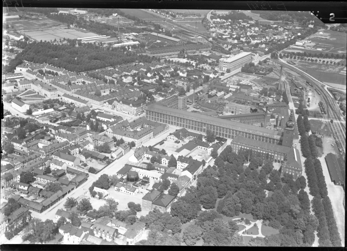 Flygfoto över centrala Västerås, med bl a ASEA och Metallverken.