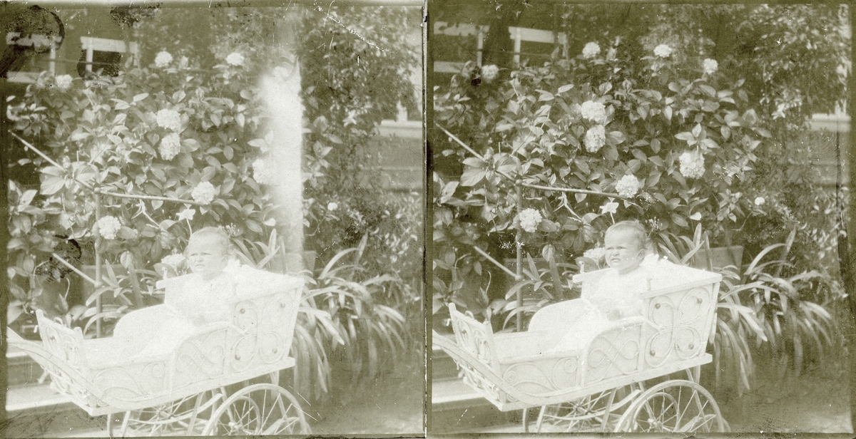 Stereoskopi. Barn i vagn framför Bruksherrgården. 1917.