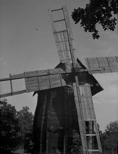 Väderkvarn av trä, med vingar.