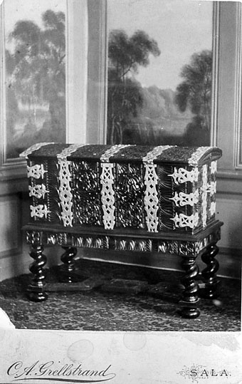 Rikt utsmyckad kista (brudkista) med svarvade ben, tillverkad av G. W. Larsson i Brunnsbo, Tärna sn.