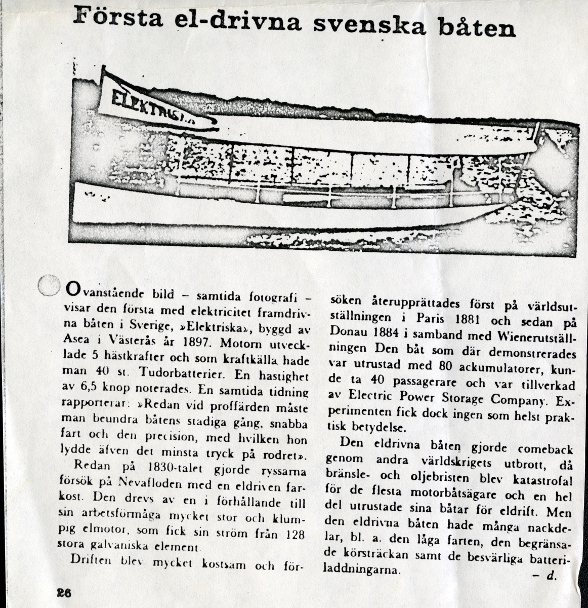 Elektrisk båtmotor och artikel om första med elektricitet framdrivna båten i Sverige - "Elektriska" byggd av Asea i Västerås 1897.