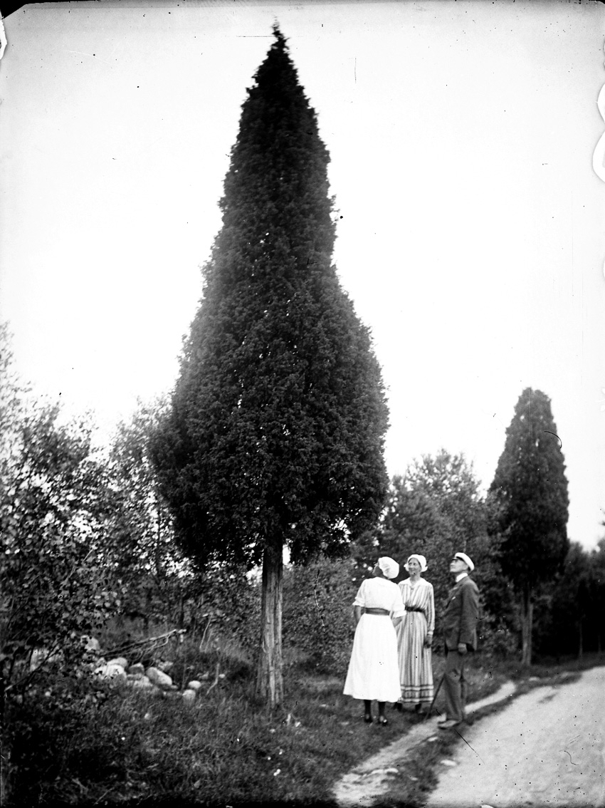 Manlig student och två yngre kvinnor vid enbuske i Ryd, Småland.