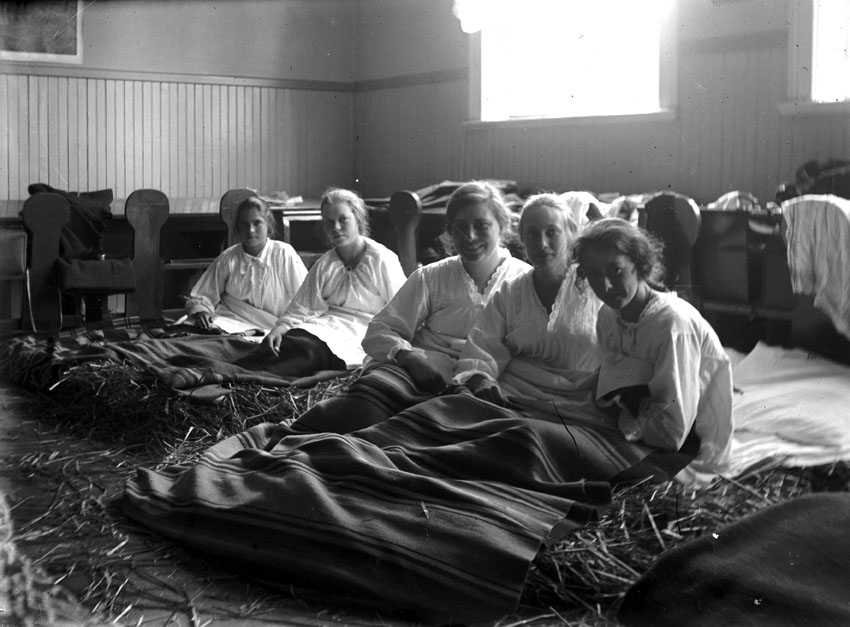 Interiör med fem kvinnor som ligger och vilar under filtar på ett halmtäckt golv.