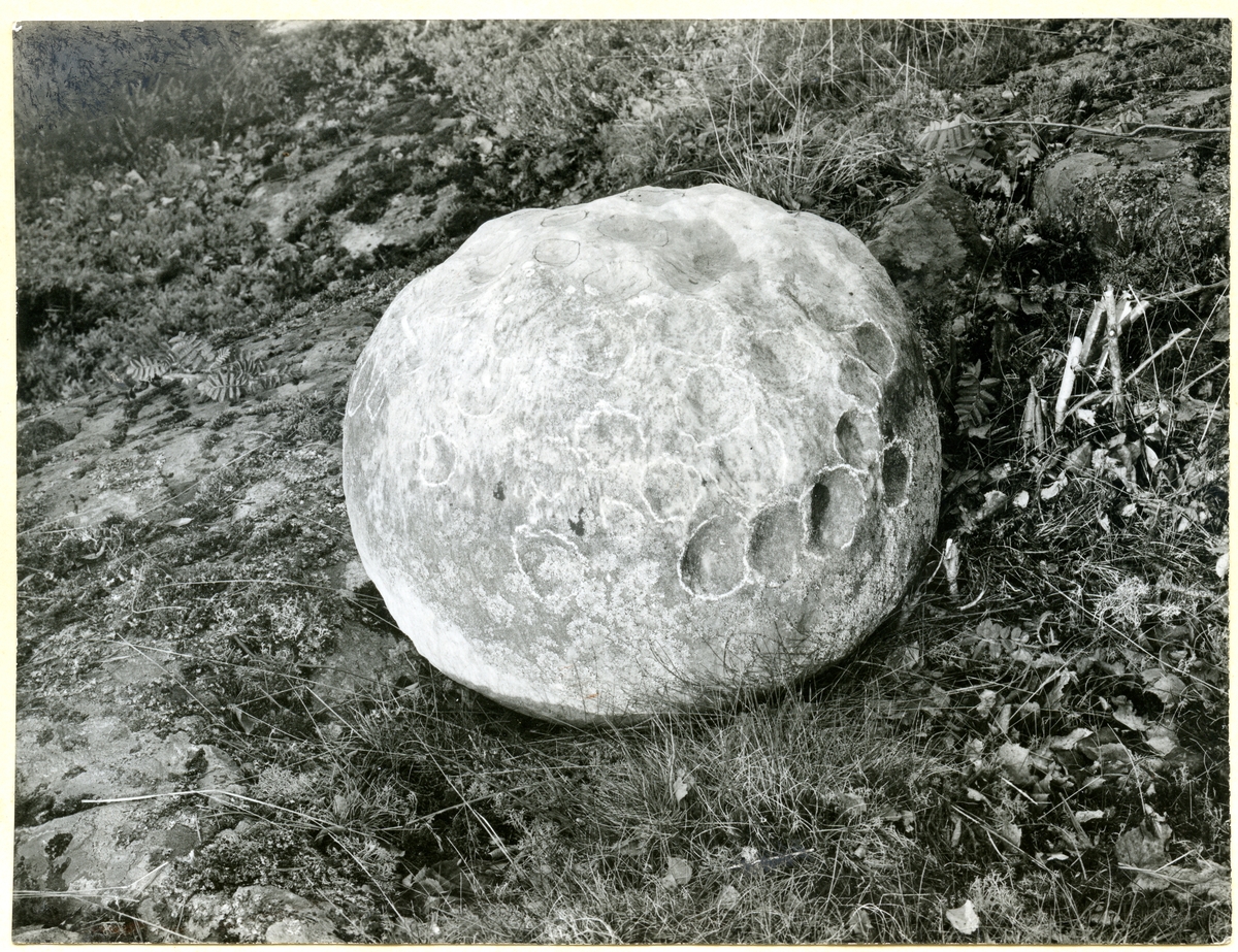 Kultsten med älvkvarnar från järnålderns mitt, vid gravhög i Åskesta, Munktorp sn, Köpings kn.