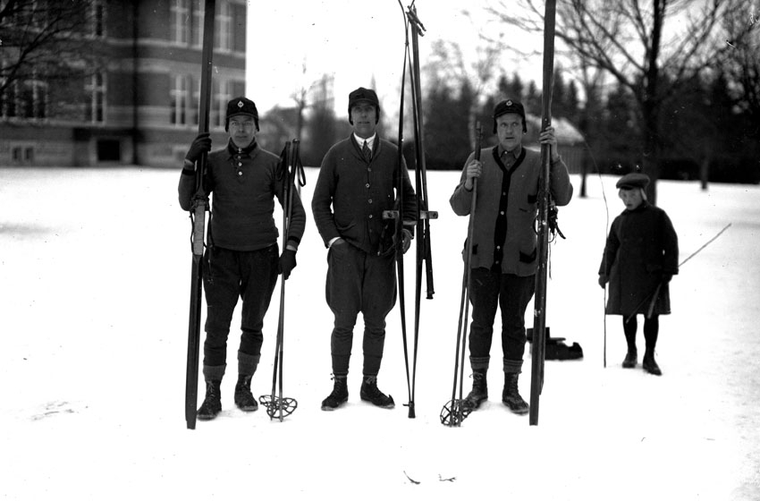 Grupporträtt av tre skidåkare, Herrgärdsskolan, Västerås.