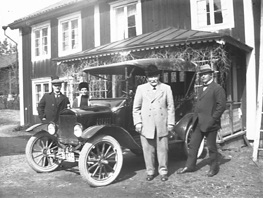 Grupporträtt, fyra personer med bil framför gårdens veranda.