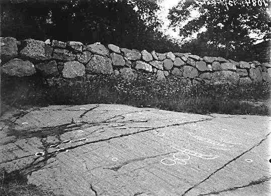 Hällristningar på Kyrkvallen utanför Björksta kyrkas kyrkogårdsmur.
